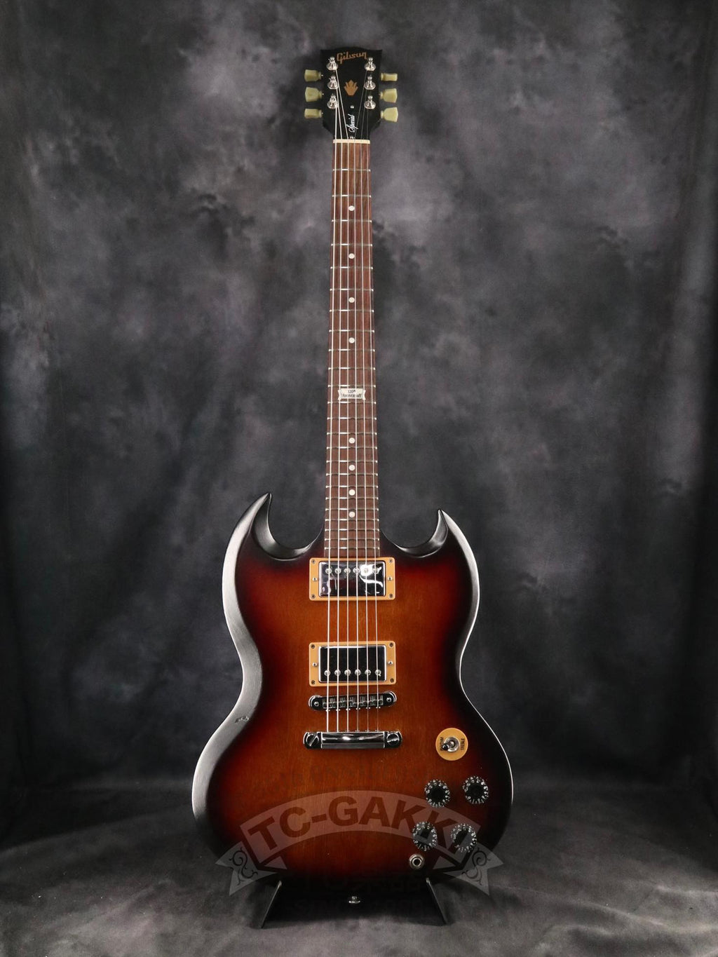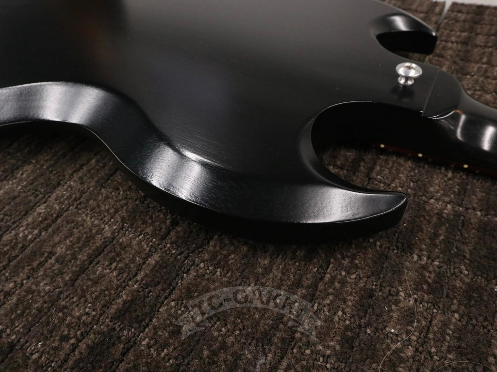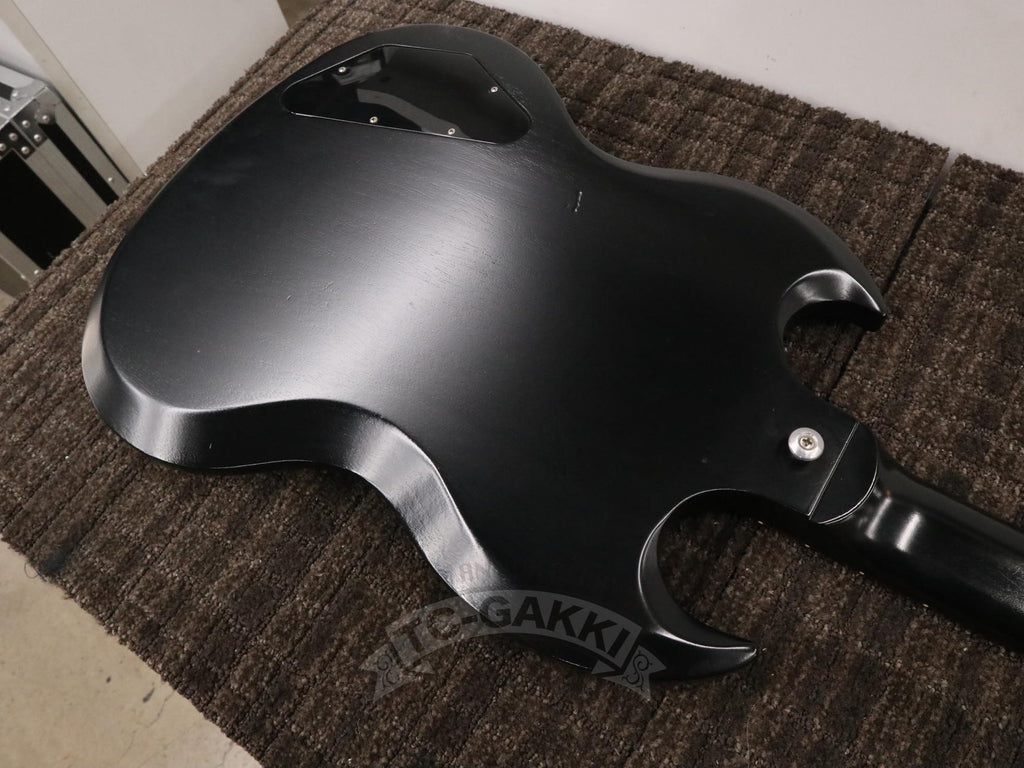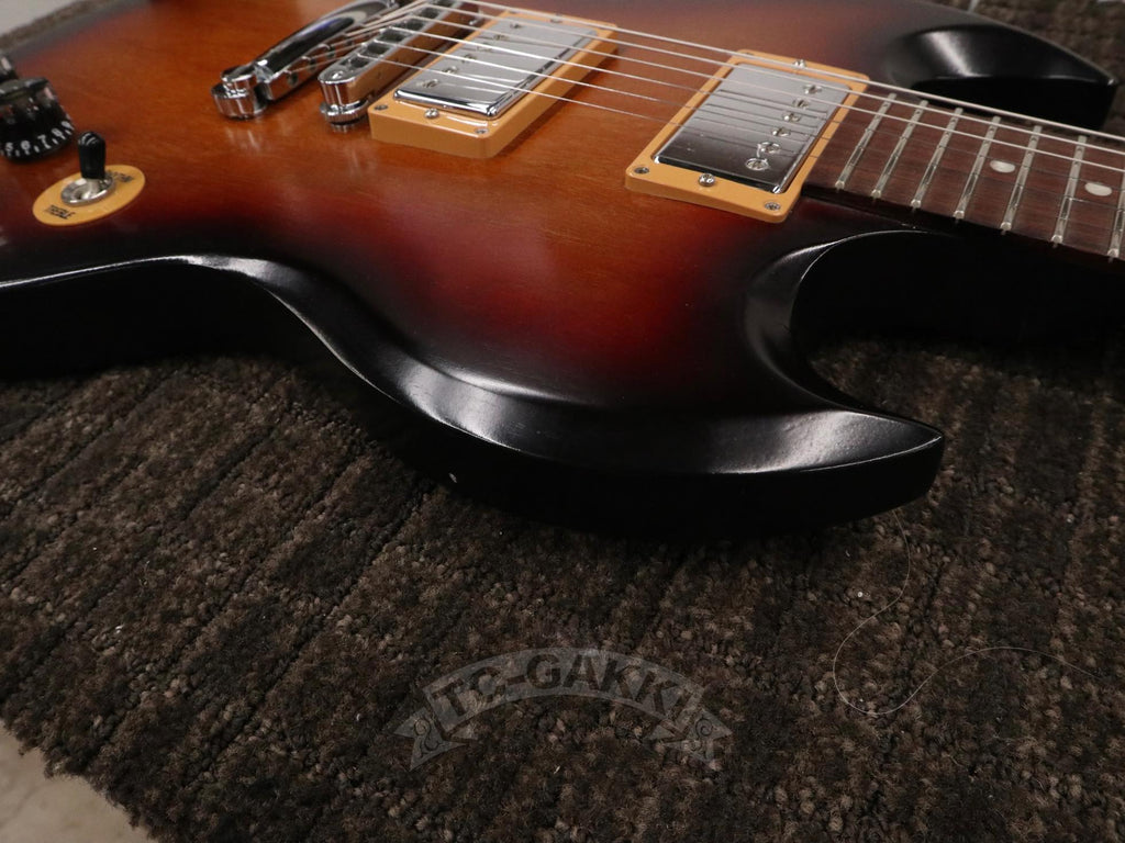 本機は、伝統的なルックスが今なお高い評価を得ている定番モデル。SGは1961年、当時のシングルカットのレスポールモデルから仕様変更として誕生し、薄いマホガニーのワンピースボディと、深いダブルカッタウェイを採用。その後レス・ポール氏との契約終了などを経て、モデル名はSG(Solid Guitar)へと変わりました。レスポールが復活した後もSGは残り続け、現在まで続くロングセラーとなっています。