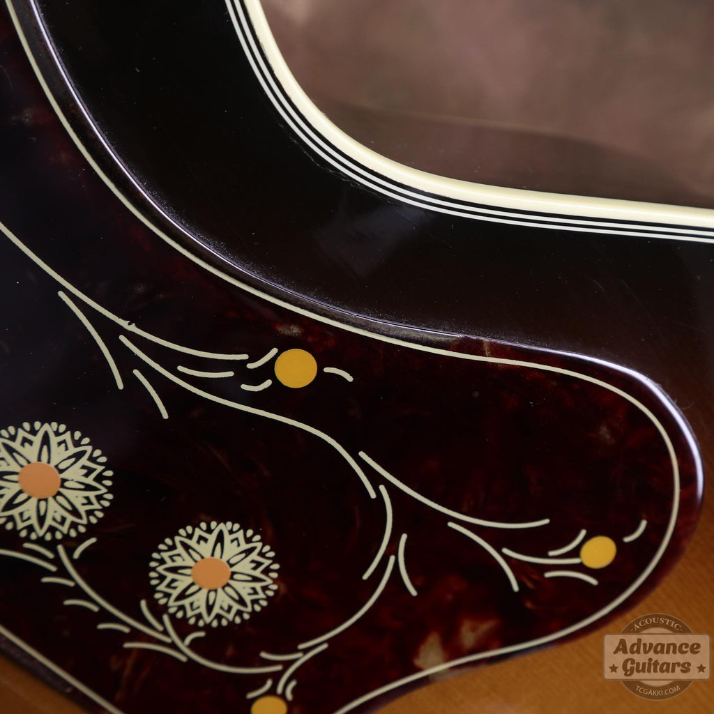 ピックガードの華やかなデザインや、マスタッシュ・ブリッジ、マザー・オブ・パールのクラウン・インレイ。