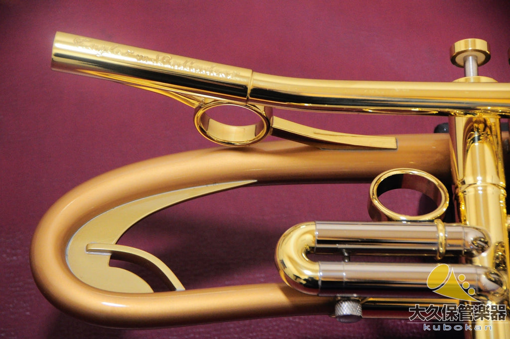本機はベンドされたマウスパイプから、緩やかに垂れ下がるベルボウ。エクストラ・ラージスロートのゴールドブラス・ベルに、前後を結ぶ支柱リングとヒレ状の意匠。どこを切り取っても、通常のトランペットとは一線を画す佇まいで、その存在はすでに楽器の域を超え、造形作品と呼ぶにふさわしい完成度を備えています。