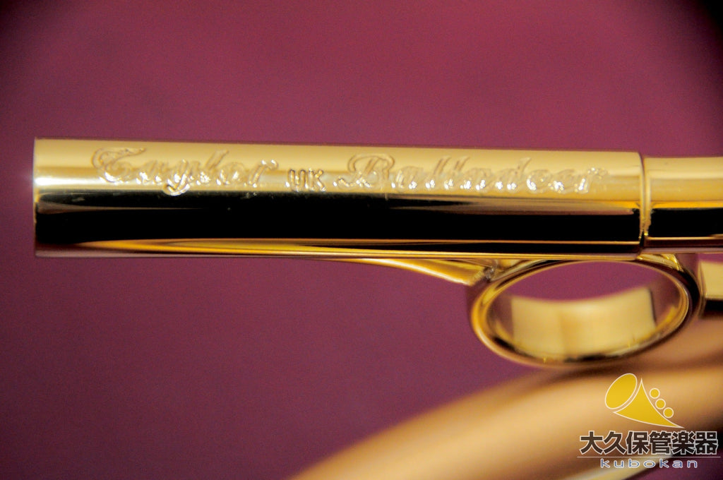 テイラーB♭管トランペット限定製作品“Balladeer”。128ミリ二枚取りゴールドブラスベル。ベンド・リードパイプ。MLボア。バルブ・ブロック:ホクソン社製。ブラッシュドサテン仕上げ(ベルインナーのみ光沢)、クリアラッカー塗装。楽器重量1458グラム。2016年製。ピストンボタン、バルブ上下キャップは2タイプ付属。ケースなし。