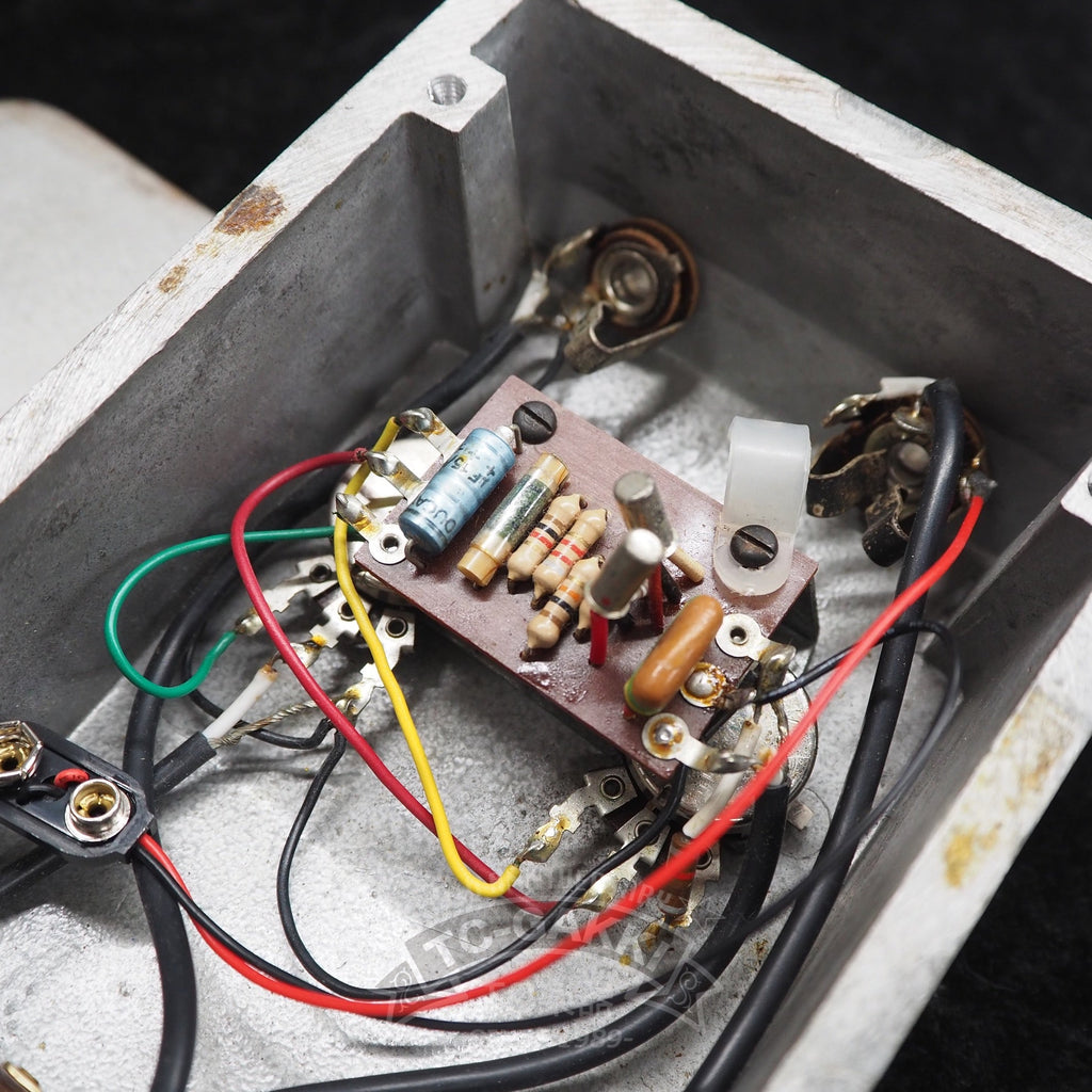 VOXのTone Benderは、1966年初期に発表されたSola Sound製のTone Bender MK1.5を元に同年後期に発表されました。そして、1968年にはブラックの筐体にシルバーパネルと仕様が変更されています。ArbiterのFuzz Faceも同様にMK1.5を元に設計されたため、よく似た回路を持っています。ファットなサウンドのFuzz Faceに対して、VOX Tone Benderは鋭く抜けるハイを備えています。バリッと毛羽立ったアタック、粒立ちの粗い歪みとタイトに引き締まったローエンドにより、激しさの中にも埋もれない音像が得られます。ギターVOLを絞るだけでカラッとしたクリーンサウンドがいとも簡単に得られるので、手元で幅広いサウンドがコントロールできます。鋭いトレブルだけでなくミッド&ローも十分あり、ズ太いサウンドを持っています。本品はどちらかと言うとミディアムゲインタイプで、音の太さは十分、多少スッキリした感があるサウンドです。近年、サウンドも含めた良品はなかなか見つけ辛くなってしまっているモデルではないでしょうか。