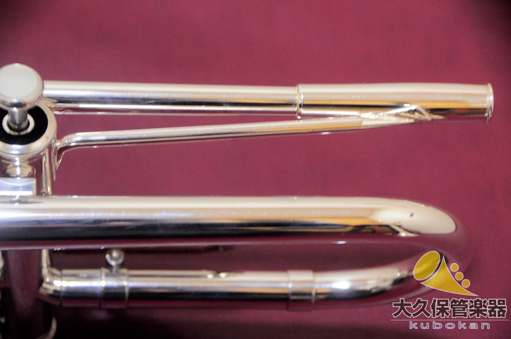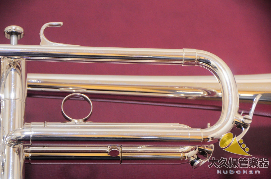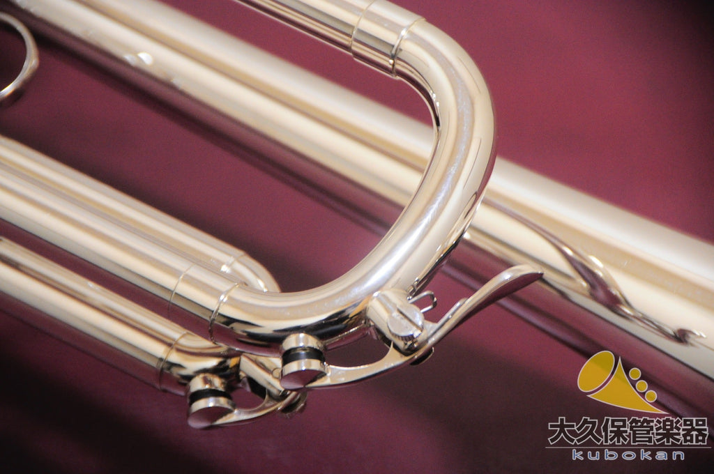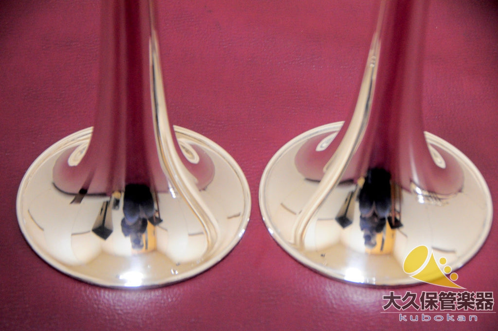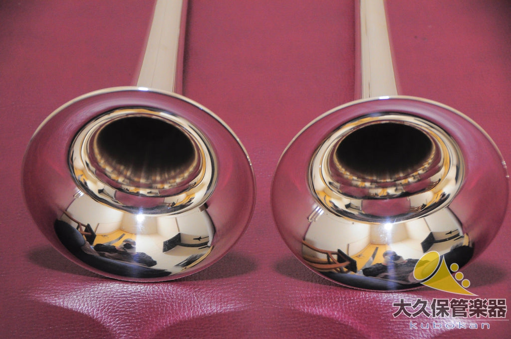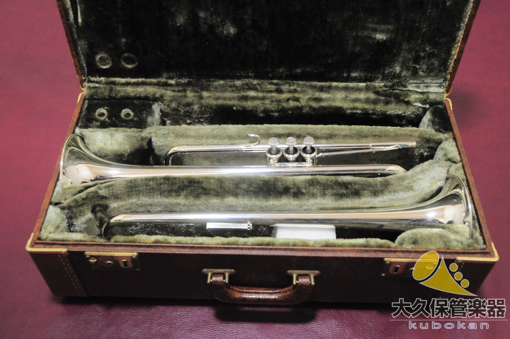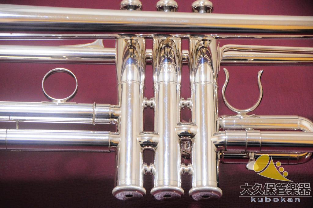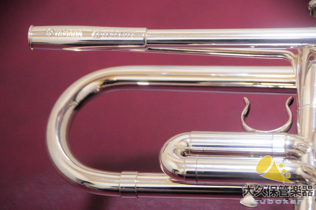 ヤマハB♭カスタム・トランペットYTR-911初期型(本体前方クルーク固定式)。チューニング式ベル2本付属。Aベル(301打刻):125ミリ・ライトウェイト・イエローブラス(重量223グラム)。アンソルダードビード(非共鳴)。やや太め。Bベル(302打刻):127ミリ・ヘヴィウェイト・イエローブラス(重量261グラム)。やや細めでなめらかな形状。ソルダードビード(共鳴)。洋白・真鍮2ピース・バルブケーシング。11.68ミリMLボア。銀メッキ仕上げ。 楽器重量1035グラム(01ベル装着時)。付属品:純正ダブルハードケース 1970年製
