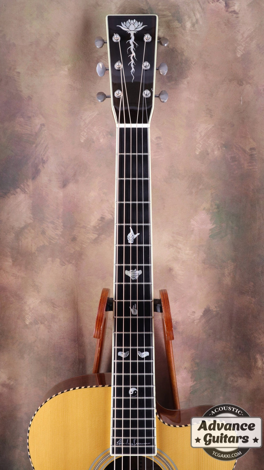 采用印度玫瑰木贴面的利落琴头,缠绕着黑白相间的琴弦,并饰有莲花镶嵌图案。